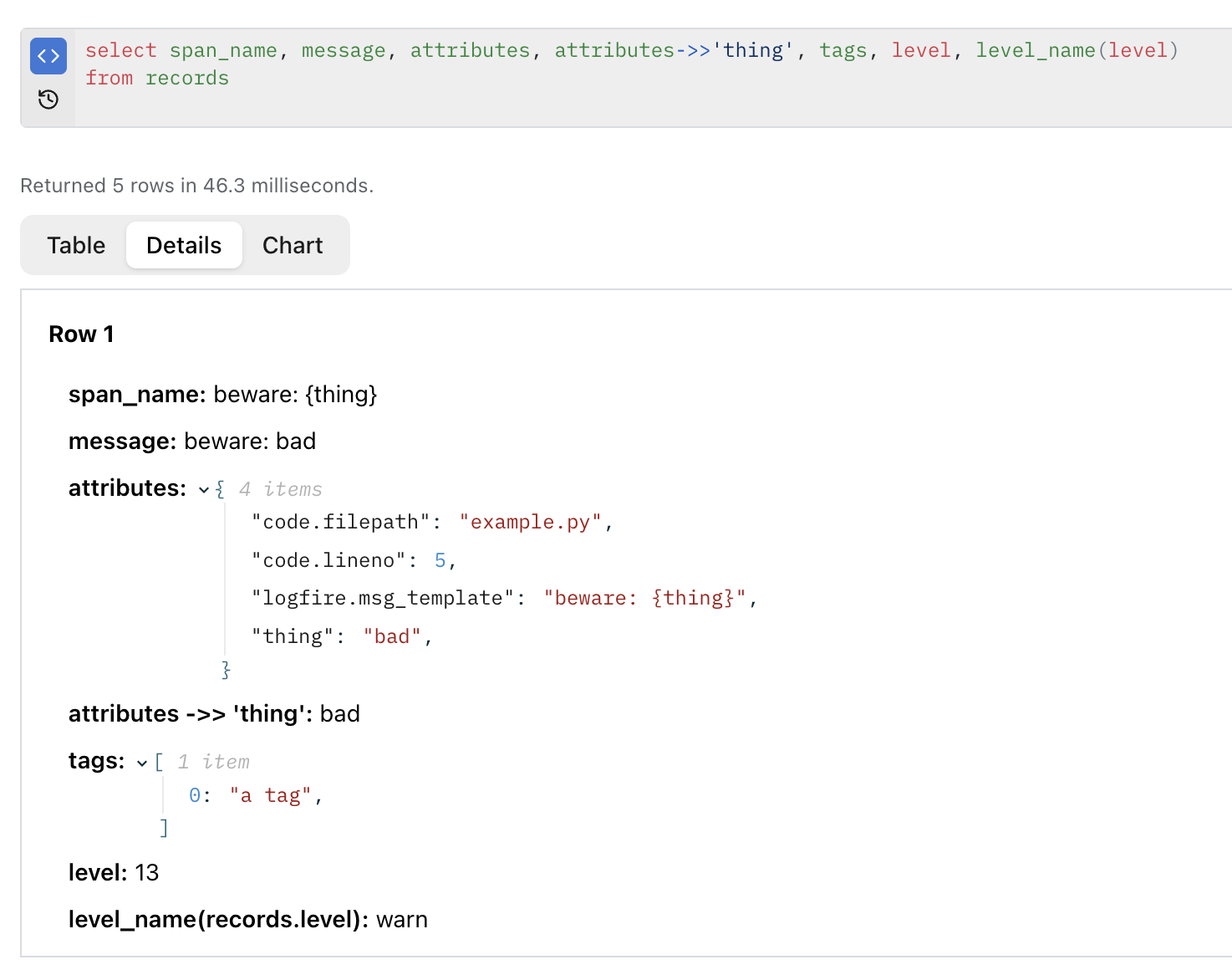 Logfire lets you query your data using SQL. The underlying database is Apache DataFusion, so the primary reference for the SQL syntax can be found in their SQL Language Reference. However it's generally meant to match PostgreSQL syntax which is easier to look up. We also extend it in various ways, particularly with JSON functions and operators such as ->>